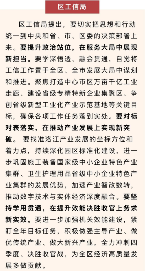 党的二十届四中全会胜利召开以来,洛江区各级各部门迅速掀起学习热潮,广大干部纷纷表示,将以习近平总书记重要讲话和全会精神为指引,聚焦区委、区政府中心工作,锚定目标、乘势而上,在推进中国式现代化洛江新实践中走前列、作贡献。