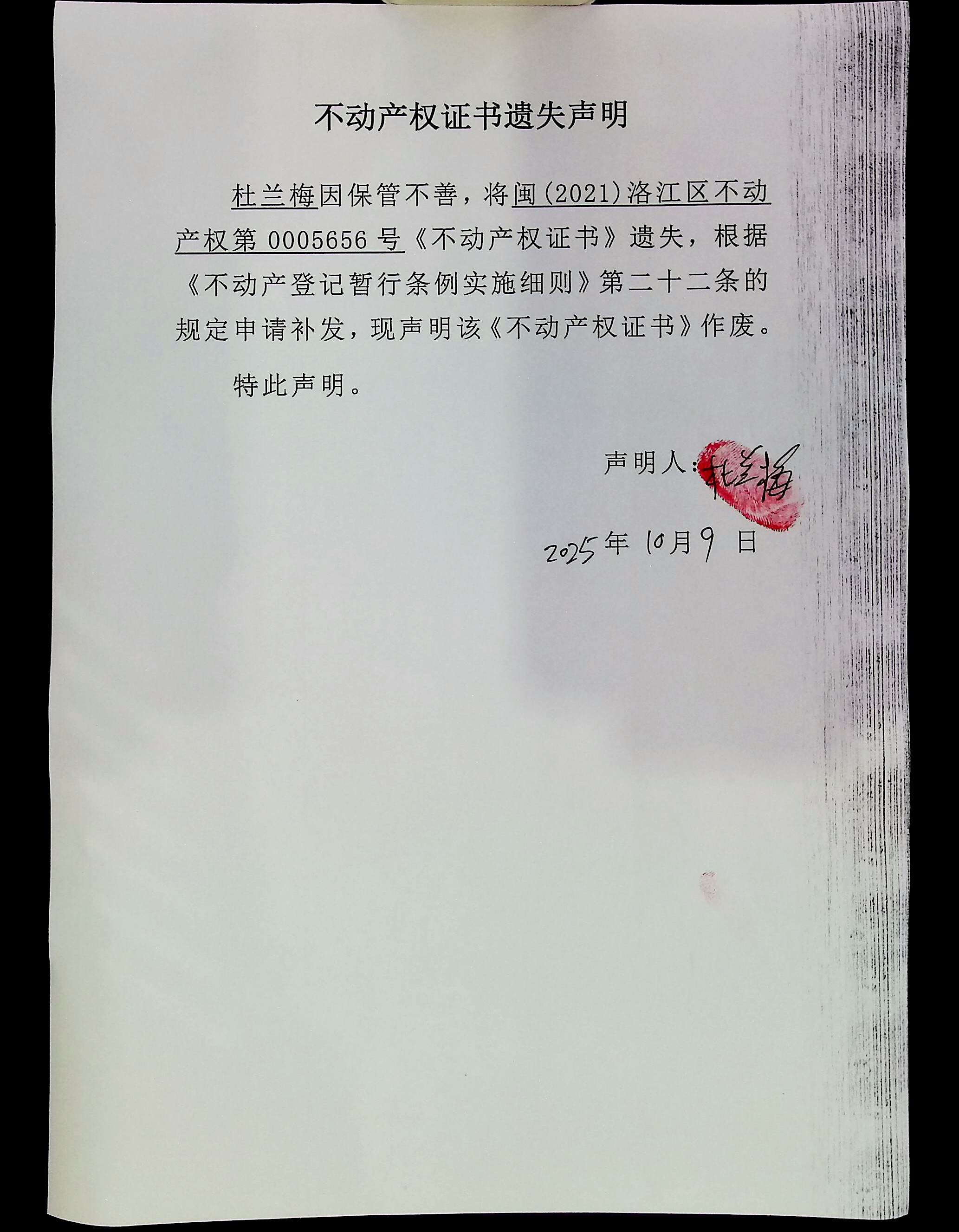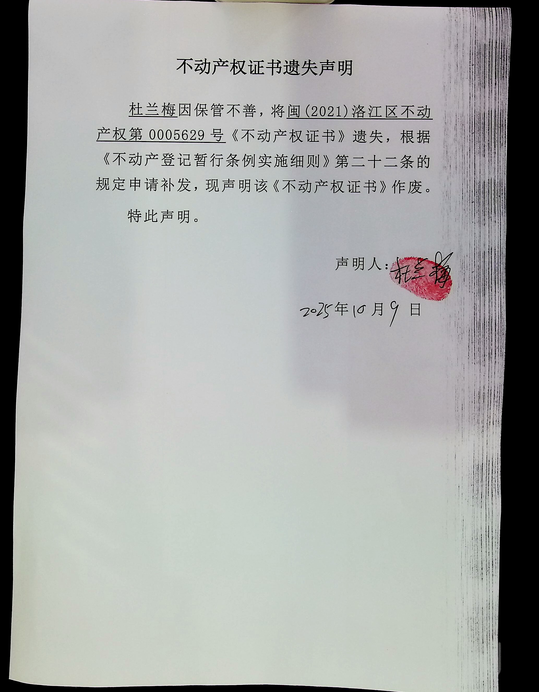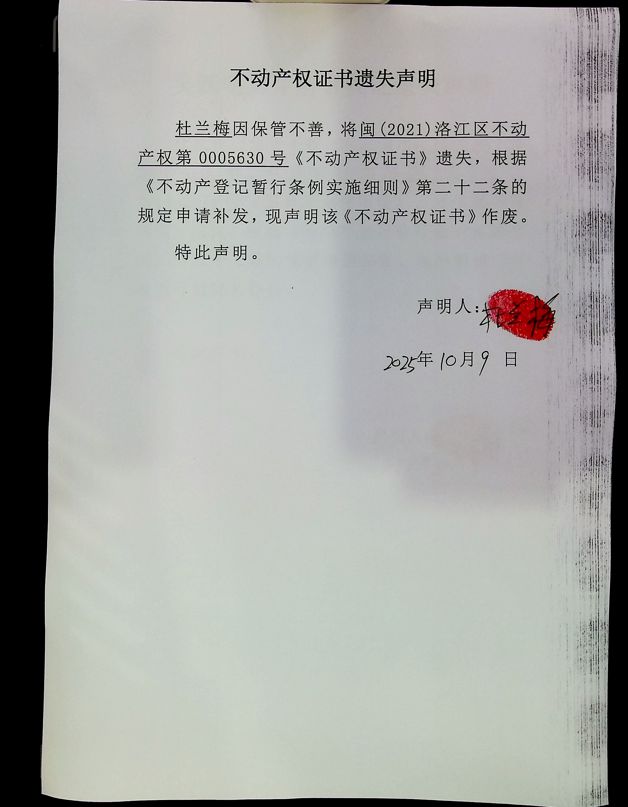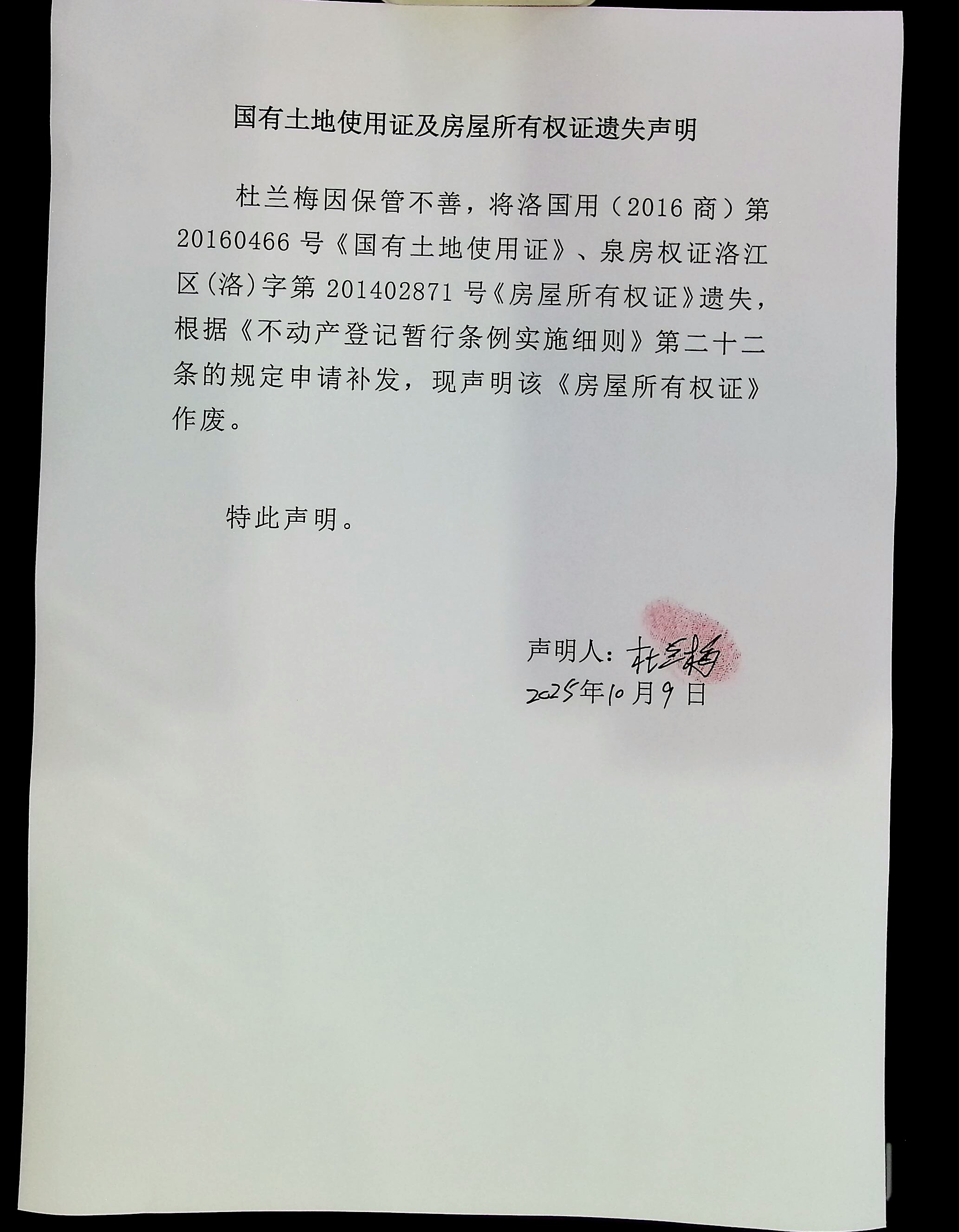 杜兰梅国有土地使用证、房屋所有权证及不动产权证书遗失声明