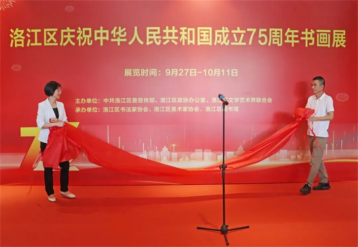 9月27日,洛江区庆祝中华人民共和国成立75周年书画展在洛江区图书馆开幕。区委常委、宣传部部长张荣伟,区政协副主席叶永萍参加揭幕仪式。