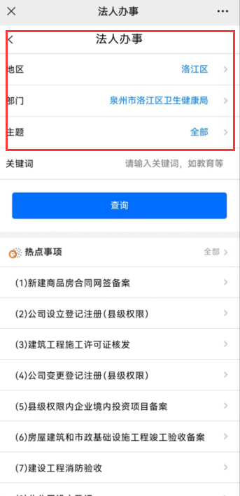 公共卫生许可证(新办)线上操作流程:经营者登录微信关注[洛江政务服务]专区点击[微服务]进入政务服务中心,点击[办事大厅]选择[个人办事或法人办事],地区选择泉州市洛江区,部门选择卫生健康局,点击查询,下拉找到卫生许可证事项,点击[在线申报]。