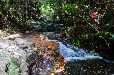 一路沿溪而行,虽正值正午,但树藤相互缠绕,形成弧形,树叶交相辉映,错落有致,别有一番乐趣。