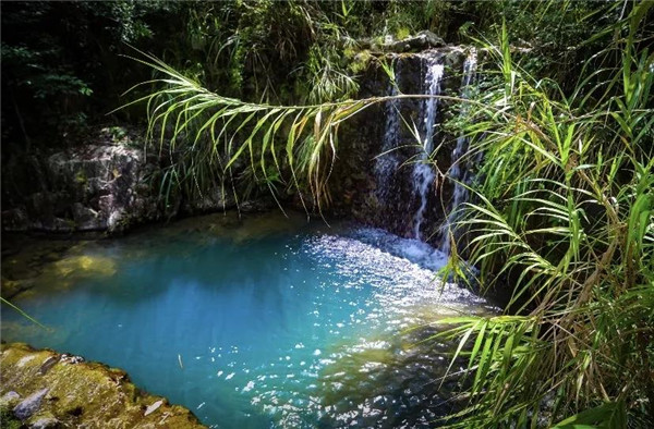 清澈见底的潭水,在阳光下折射出五颜六色的光。潭底深浅不一,潭水泛着不同层次的碧绿,悬潭四周高崖围合,犹如置身于一个葫芦中,潭水如同镶嵌在其中的一颗巨大的翡翠。