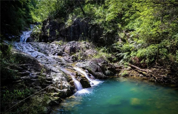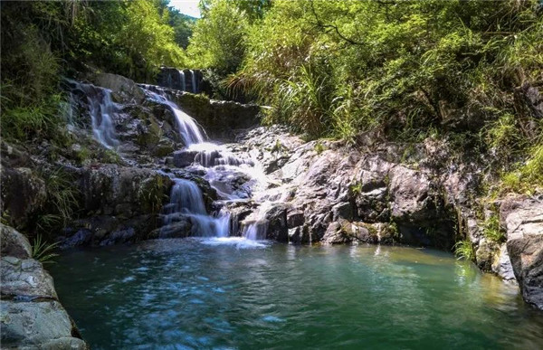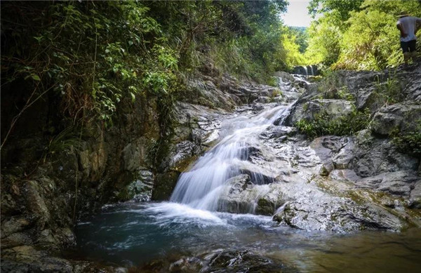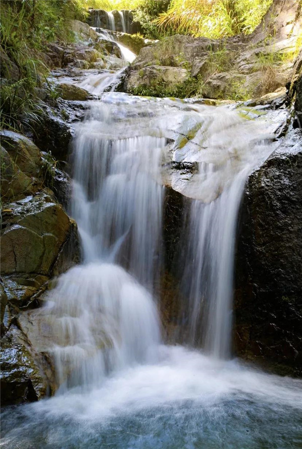 在五掌山中,大大小小的瀑布有几十余处,形成了很多连续的天然瀑布,人称“七连瀑”。叮咚的山泉水沿着嶙峋的山石流淌下来,汇聚成一汪清澈的潭水,如同一副有声有色的山水画。