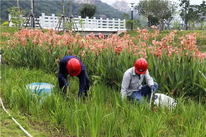绿化园林养护工正在进行修剪、施肥、除草等工作。 郭晓玲 摄
