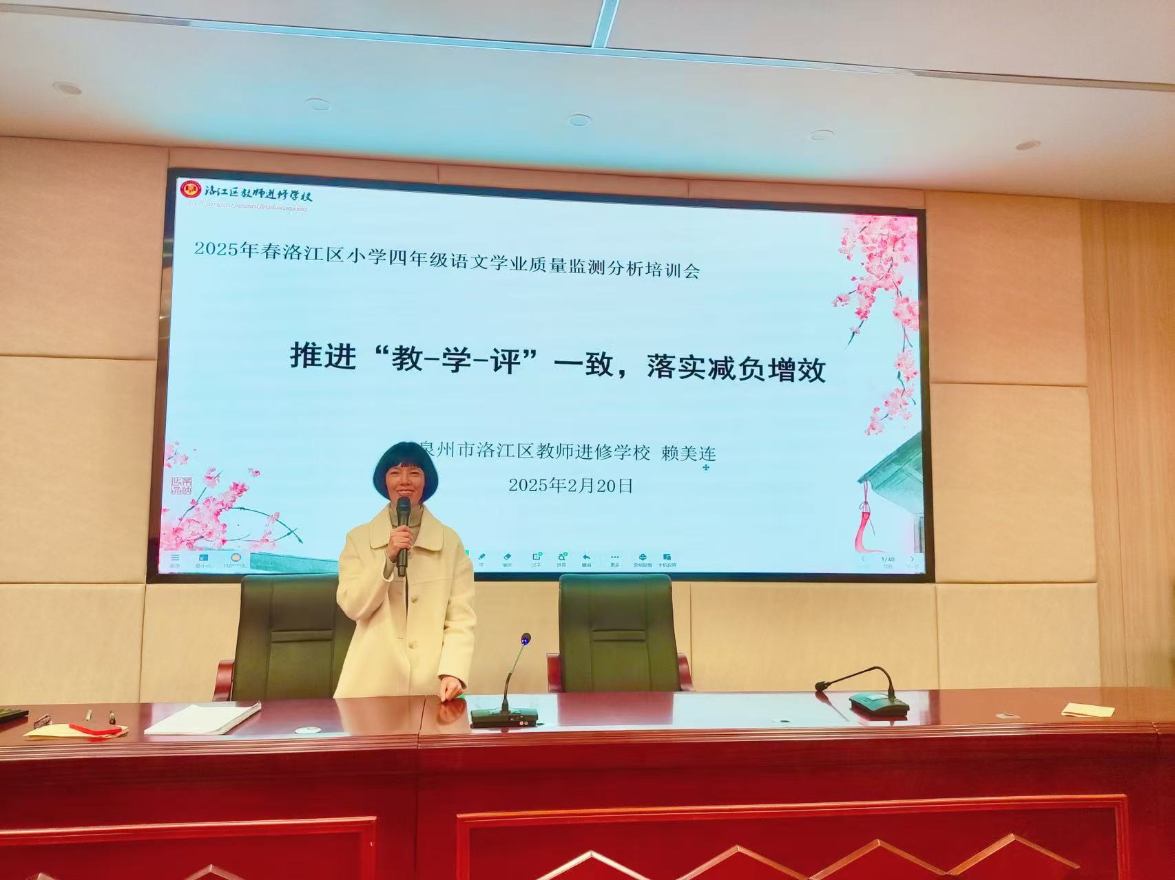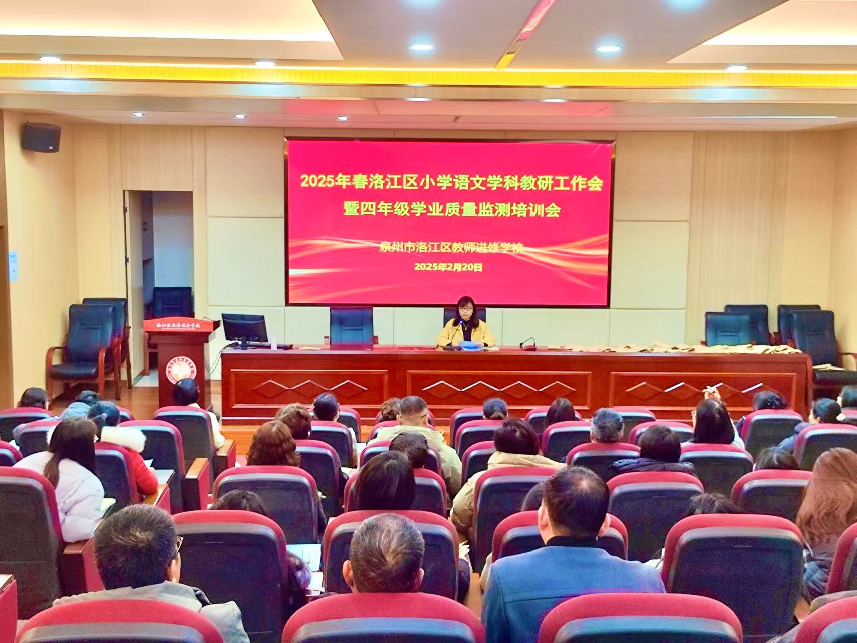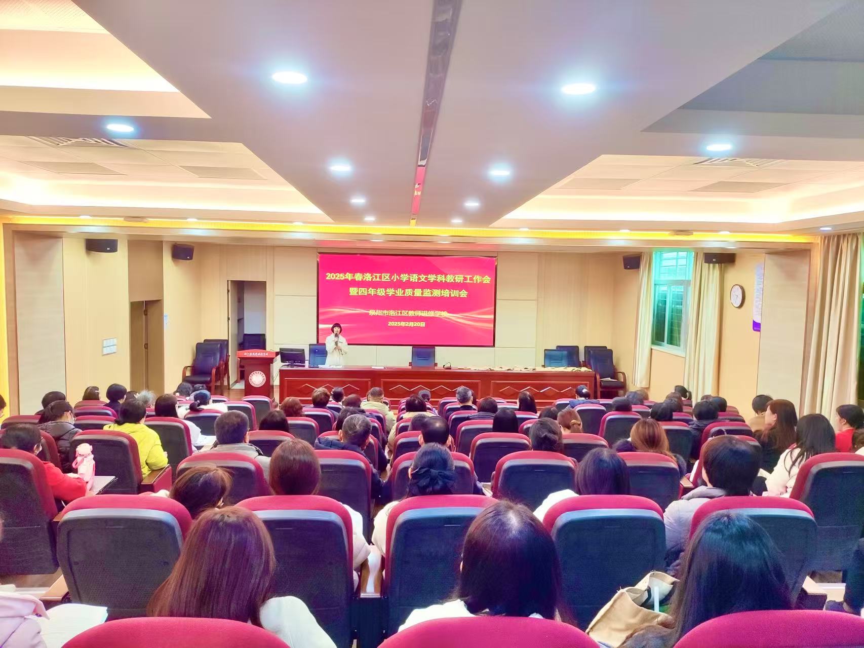 为更好地部署2025年春我区小学语文学科教科研训工作,凝聚全区教研力量,促进区内各小学间的互动交流,落实“教-学-评”一体化,更好地迎接国家义务教育学业质量监测。2月20日,区教师进修学校举办小学语文教研工作会暨四年级学业质量监测培训。区教师进修学校分管领导,小学语文专、兼职教研员、各校语文教研组长、四年级全体语文教师等120多人参会。活动由区教师进修学校小学语文教研员赖美连老师主持。