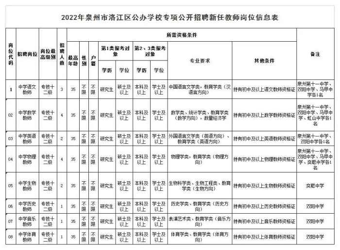 为进一步引进优秀师资和教育人才,满足教育事业发展要求,根据事业单位公开招聘工作人员等有关规定,结合泉州市洛江区教育发展工作需要,决定组织2022年泉州市洛江区公办学校专项公开招聘新任教师工作,具体方案如下: