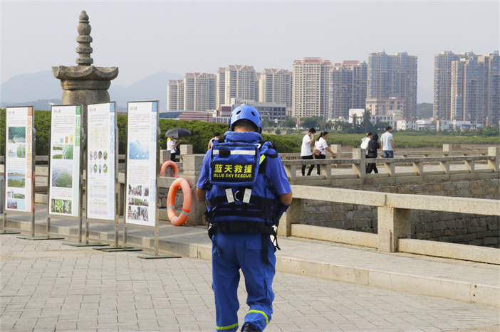 在洛阳桥世遗警务联络点外,泉州蓝天救援队队员蔡文安正在穿戴装备准备与民警开展步巡工作。“我身上穿的浮力救生衣可以承受两个成年人的重量,抛绳设备在救援的时候可以拉人,能够有效防止溺水者将救援人员拖入水中。岗前我们有教练员进行专业培训,平时我们也通过加强训练来提高技能。”蔡文安说道。作为现存最早的跨海梁式石桥,素有“海内第一桥”之誉的洛阳桥,现如今已成为网红景点,吸引众多海内外游客到此旅游打卡,更多的人气带来的是更大的客流压力,这背后离不开民警辅警的日夜守护。泉州市公安局洛江分局聚焦涉险公共区域安全防护工作,全面加强临水临崖等涉险公共区域安全管理,全力排查整治安全隐患,切实筑牢安全防线。