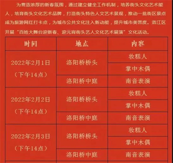 洛江区文体旅游局副局长吕翔宇介绍:“今年是泉州申遗成功的第一个春节,为了进一步发挥好申遗效应,我们不仅在洛阳桥头及桥南古街进行新春佳节的氛围布置,融入‘福文化’元素打造‘网红打卡点’,并设置洛江文旅资源展示展板,我们还安排了非遗项目进遗产区。正月初一、初二、初三,还有元宵节,我们将安排妆糕人、掌中木偶、南音等项目在遗产区进行表演。此外,洛阳桥游客中心也将每天安排志愿讲解员进行讲解服务,让游客玩得舒心、开心。”