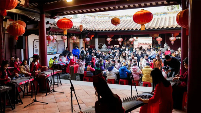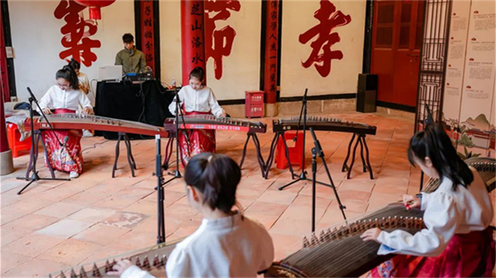 随后,一首首悠扬动听的古筝曲目在刘氏家庙内奏响。