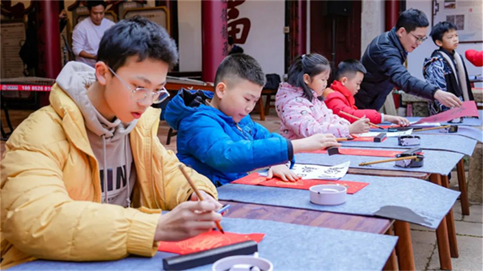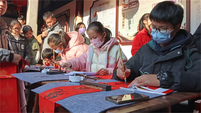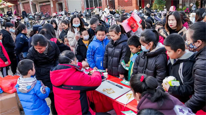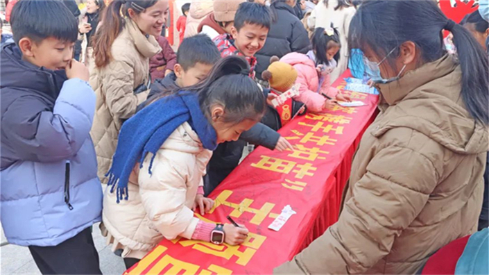 与此同时,小小书法家们挥毫泼墨,代表吉祥如意的词句跃然纸上,群众纷纷上前挑选各自喜欢的春联,现场充满着浓浓的年味。