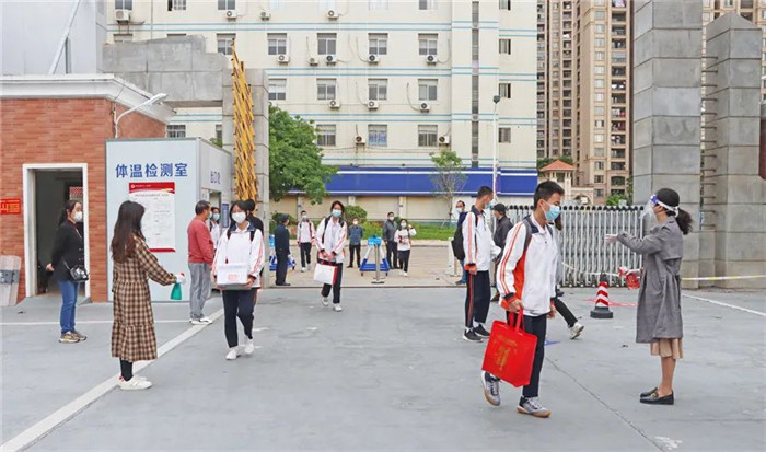 入校测温、身份核验、消毒、搬书……在泉州第十一中学校门口,初三、高三学生佩戴口罩陆续到达学校,在老师的指引下,以间隔一米的距离依次进行红外线测温、酒精消毒,井然有序地分批错峰进入校园。