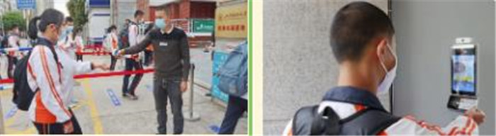 “复课后,我们学校实施封闭式管理,不能住宿的师生需签订承诺书,坚持家校‘两点一线’,在校学习生活期间,我们严把入门关,每日进行晨、午、晚检三次体温检测,要求学生在校内需戴好口罩,保持一定安全距离,不得跨班,不得聚集。就餐方面,我们由食堂统一配餐,每班学生分两个教室用餐,避免交叉接触。”学校党总支副书记吕凌宁说道。