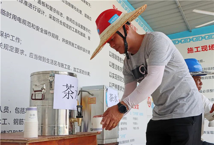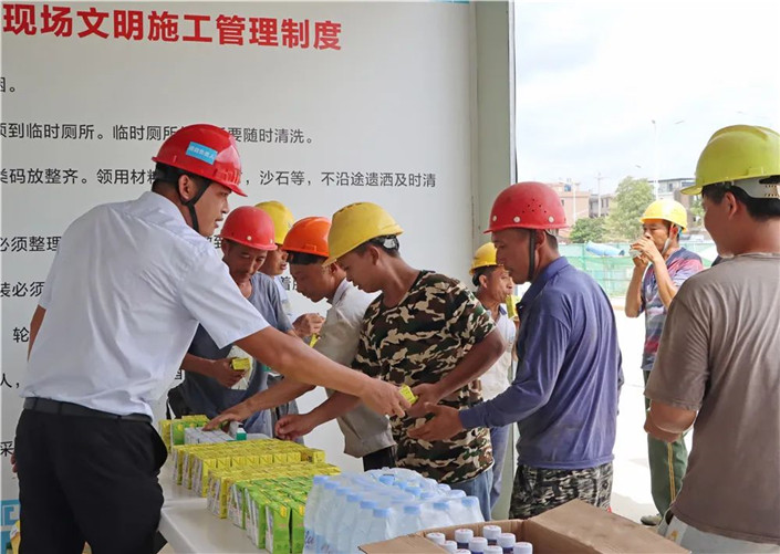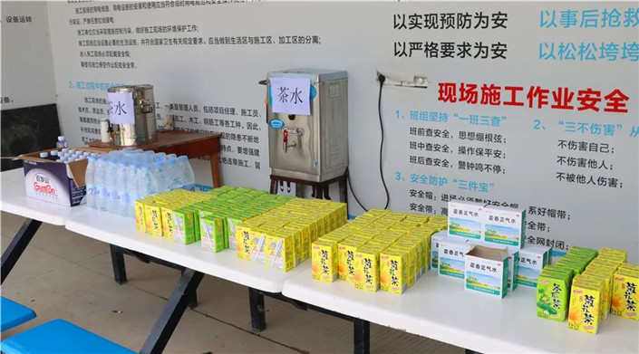 “每天早上我们都会组织各班组长开早会,确保安全防暑落实到位;采取错峰作业及轮换作业,适当增加工作人员休息时间,并按照每人每天12元的标准发放高温补贴,并提供解暑饮品、药品,配齐电风扇等设施,全方位保障施工人员身心健康。”任华伟说道。