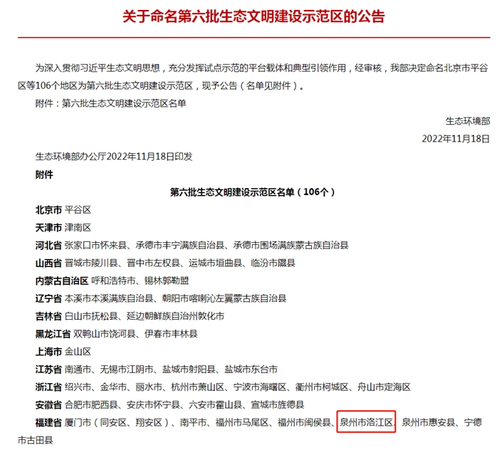 11月19日,在江西召开的中国生态文明论坛南昌年会上,泉州市洛江区被生态环境部授予“第六批国家生态文明建设示范区”荣誉称号。区政府区长郭宁带队参加授牌仪式,并参加生态文明示范建设论坛活动。