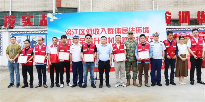 仪式上,杜仁义等领导将泉州精镁科技有限公司、泉州市恒毅卫生用品有限公司等爱心企业募捐的消防器材交接给各乡镇(街道)负责人,并向爱心企业颁发捐赠荣誉证书;区消安办介绍洛江区低收入群体居住环境消防安全提升工程项目情况,将坚持“一户一策”,为低保对象、特困人员、低保边缘家庭配发消防器材。