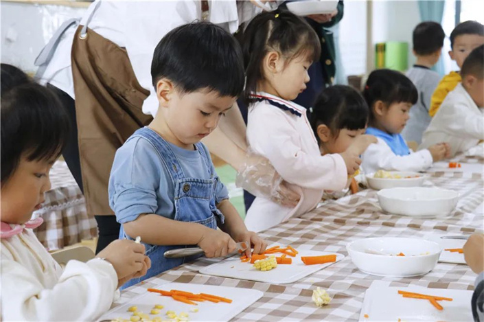 “这是什么呀?”“胡萝卜”“什么小动物爱吃胡萝卜呀?”“小兔子”……5月10日上午,在信和托育园托大班里,一堂生动有趣的《五色饭》课程正欢快地进行着,幼儿们在和老师的互动交流下认识蔬菜,学会动手洗菜、切菜、制作五色饭,通过锻炼手部精细动作的技能,培养幼儿的手眼协调能力,提高幼儿的动手能力。