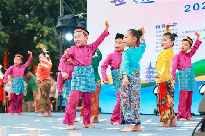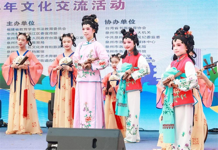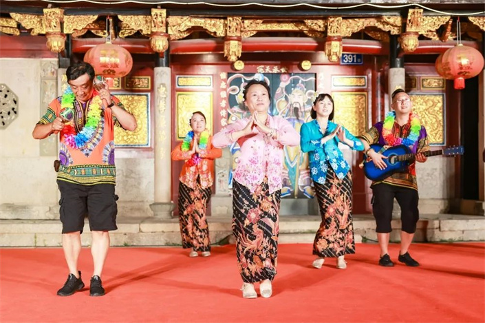 伴随着阵阵喝彩,武术表演《盛世雄风》、南音表演唱《荔镜奇缘》、印尼舞《椰岛欢歌》等节目轮番上演;来自台湾的学生们也带来歌舞民谣《望春风》、合唱《当我们同在一起》,两岸同胞在表演中感受闽台文化的交融与共鸣。