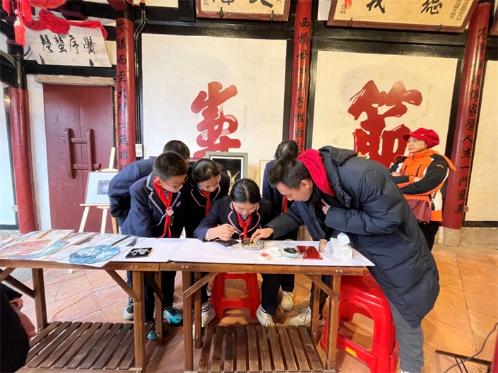 家庙内前庭,非遗项目传承人正在传授如何将蛋壳镶嵌进漆画作品里,一幅精美的漆画作品已初见雏形。