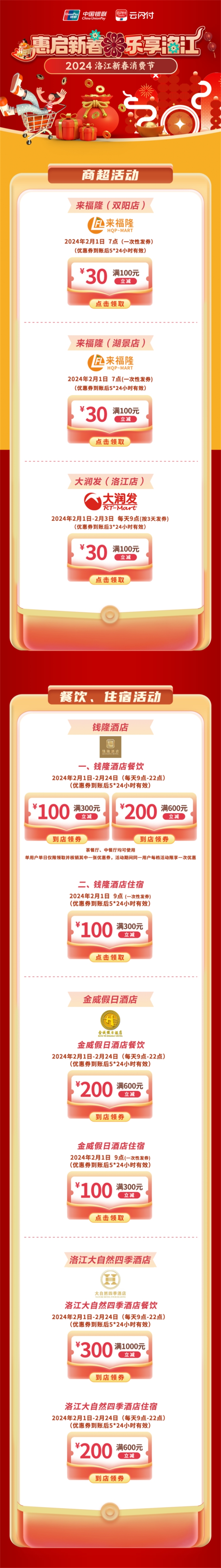 本次活动以“惠启新春 乐享洛江”为主题,按照“政府补贴 企业让利”原则,联合各大商家发放百万消费券,覆盖商超、餐饮、住宿等行业。其中大润发、莱福隆、来福隆等超市满100元立减30元;钱隆酒店、大自然酒店、金威酒店等场所住宿均可享受满300元立减100元折扣;钱隆酒店、大自然酒店、金威酒店等场所餐饮可享受满300元立减100元或满600元立减200元或满1000元立减300元折扣。2024年2月1日-2024年2月24日,市民可通过银联云闪付APP或刷银联卡,到指定合作商家门店享受优惠。