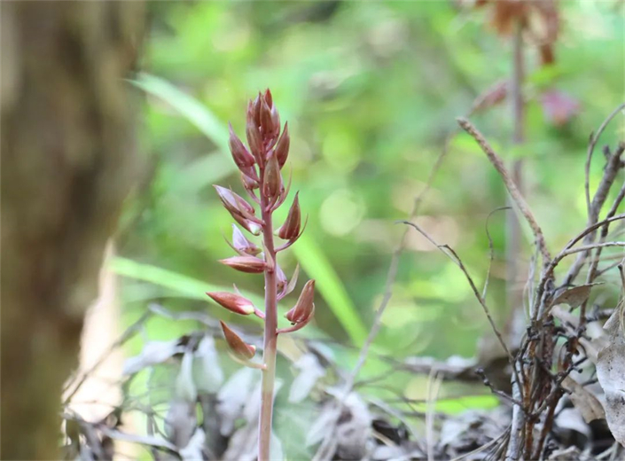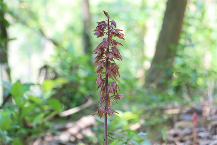 来到泉州罗溪省级森林公园,可以看到现场共生长了4株不生长绿叶的无叶美冠兰。褐红色的花葶粗壮,高度不一,但花序直立,顶部有一簇簇褐黄色的花苞,在一片绿叶之中显得格外特别。目前该物种已列入《濒危野生动植物种国际贸易公约》(CITES)附录Ⅱ,为全世界管制其国际贸易的物种。
