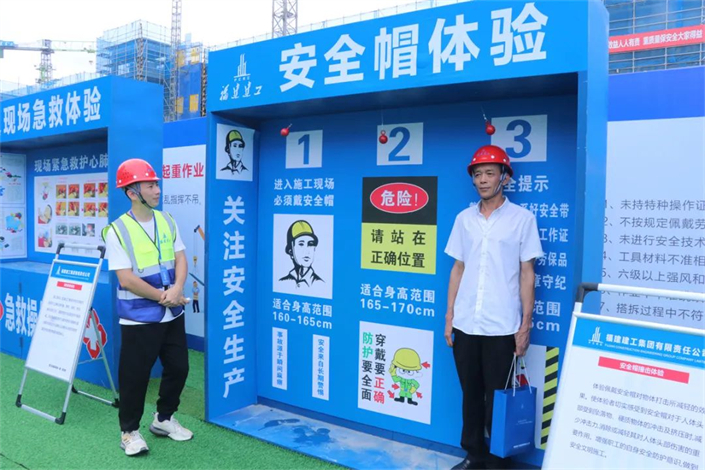 随后开展洛江区医院项目一期安全生产标准化建设观摩活动。现场以“展示+体验”的形式进行,通过设置了屋面工程样板、水井电井样板等区域及综合用电体验、现场急救体验、VR安全体验馆等多个互动体验项目,介绍了项目在安全生产、工地建设等方面的亮点,并让参观者通过亲身体验,深刻感受安全生产的重要性。在观摩过程中,观摩人员与现场讲解人员积极互动,不时就具体问题展开深入探讨交流,大家纷纷对本次观摩中的先进经验做法给予充分肯定。