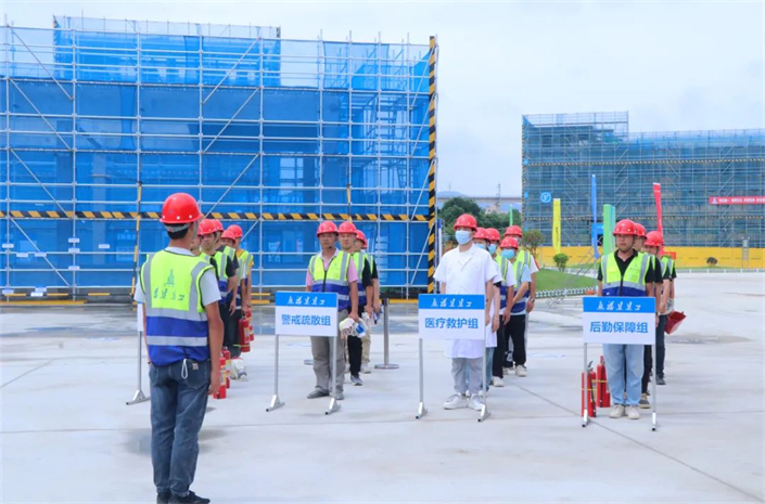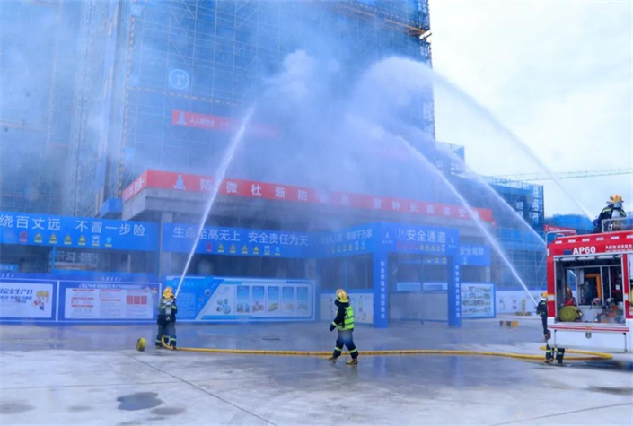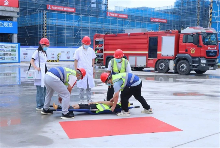 现场还组织消防应急救援实操演练,模拟施工现场用电不规范导致火灾。事故发生后,工地迅速启动消防应急预案,施工单位组建应急救援小组迅速反应,并第一时间请求消防及救护援助。随后,消防应急车辆和救援队伍也赶赴现场进行灭火和救援工作。演练过程中,各岗位人员反应迅速,协同配合,疏散过程安全有序。