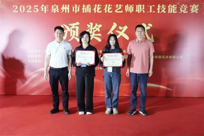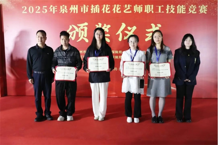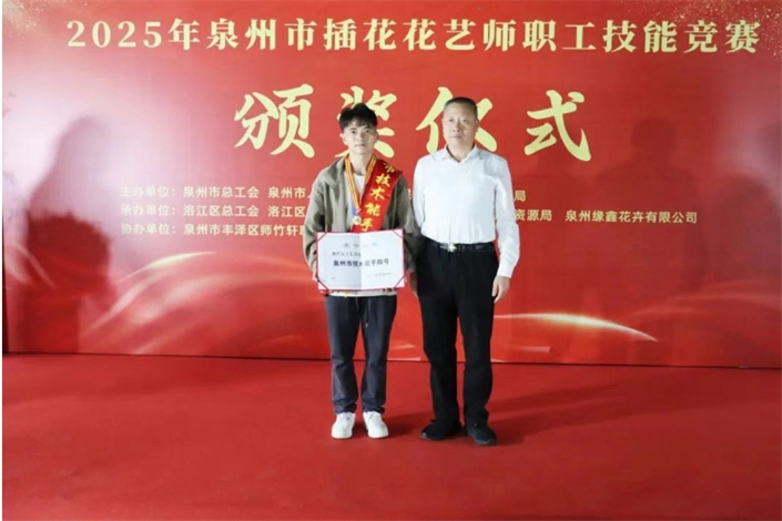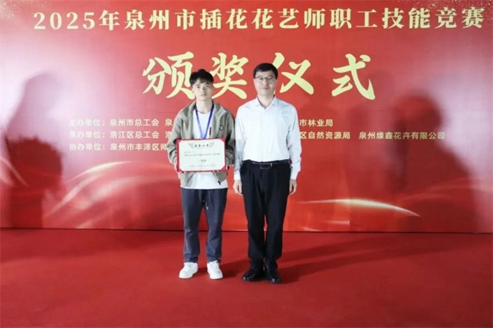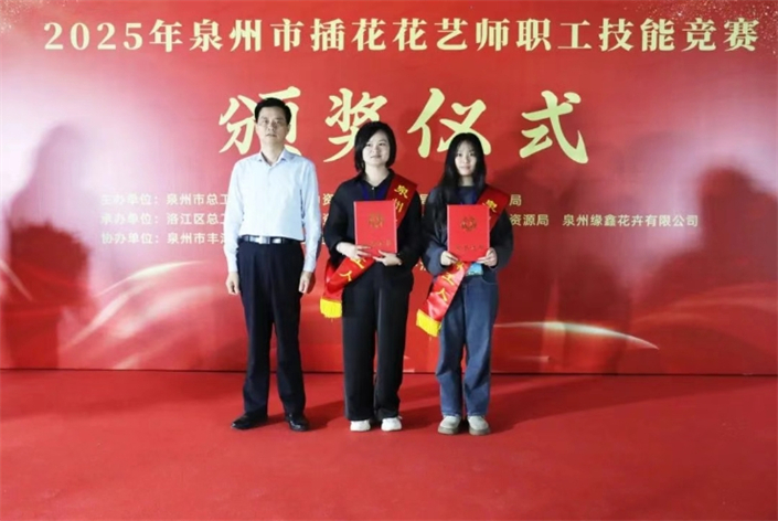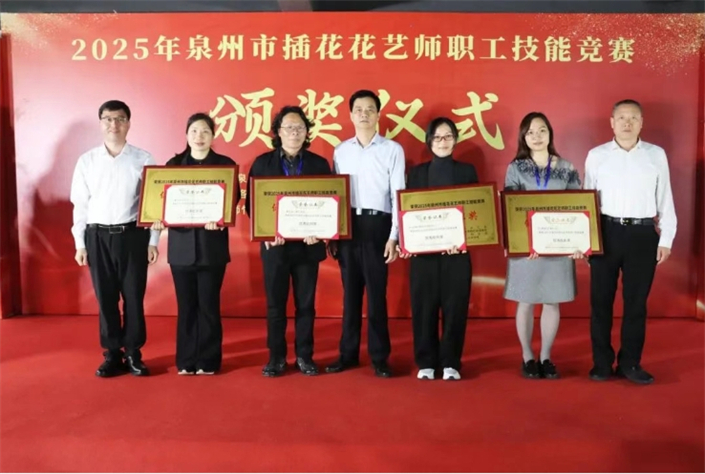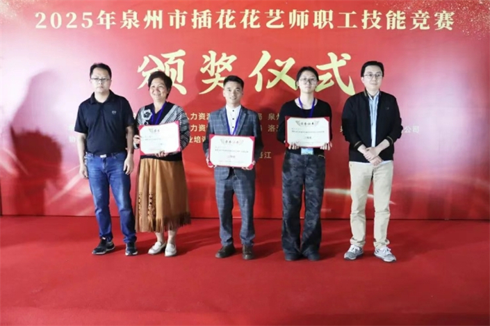 日前,2025年泉州市插花花艺师职工技能竞赛在洛江举办,来自各县(市、区)36支队伍参赛。市总工会副主席陈坤生,市人社局四级调研员李向阳,区委常委、区总工会主席郑友飞参加颁奖仪式。