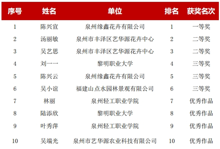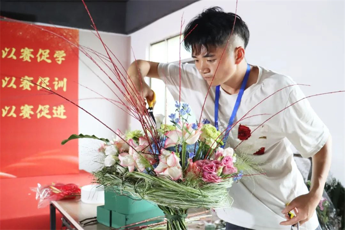 最终,评委从主题创意、色彩造型、插花技巧等方面对参赛作品进行打分,累加理论考试成绩后,评选出一等奖1名、二等奖2名、三等奖3名、优秀作品奖4名。