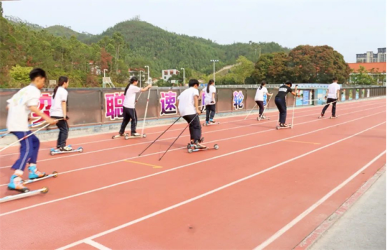 在泉州市奕聪中学的轮滑场内,学生们正在进行每周两次的训练。双腿弯曲蹬地,身体略向前倾,配合手杖的推动,他们在平地飞快滑行,奋力争先,尽情地体验夏日“越野滑雪”的乐趣。