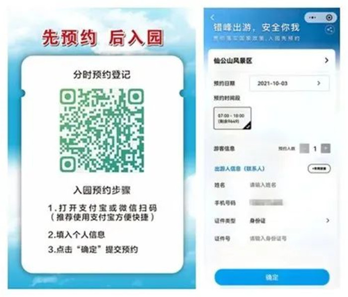 点开支付宝或者微信长按识别下方小程序进入“泉州市智慧旅游云平台”进行预约;或点开微信搜索小程序“泉州市智慧旅游云平台”--搜索“仙公山风景区”选择“错峰出行,安全你我”即可预约,也可代同行人员预约。