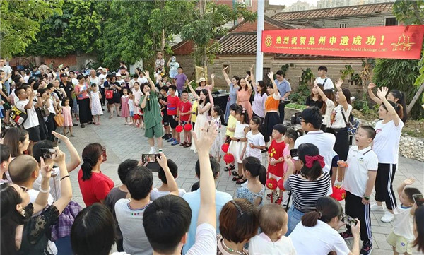 消息传来,群众欢呼雀跃,共同喊响口号:“热烈庆祝泉州申遗成功!”“大美洛江 泉民拾遗”非遗文化快闪节目表演在洛阳桥上演。