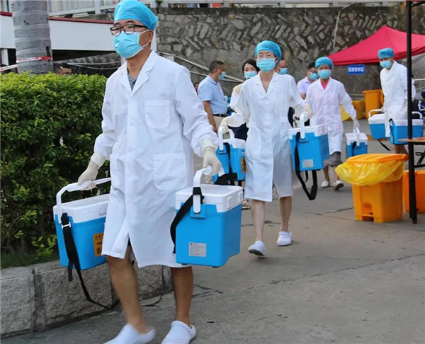 采集区内,5组采集人员按照采样规范,同时对受检居民进行咽拭子采样,按10:1比例混检。采样工作人员收集并核对样本数量和条形编码,规范准确填写转运单后,由专人转运至泉州市第一医院核酸检测基地进行检测。
