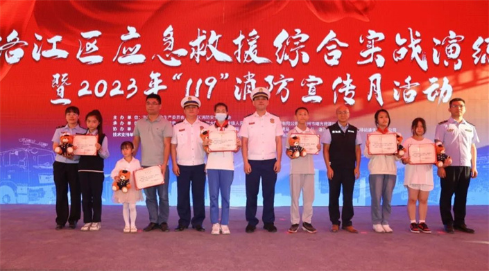 2023年“119”消防宣传月活动中,与会领导为洛江区“热心消防公益事业”先进个人和洛江区在市第二届“小小消防员”儿童绘画作文大赛中获奖人员颁发证书和纪念品。
