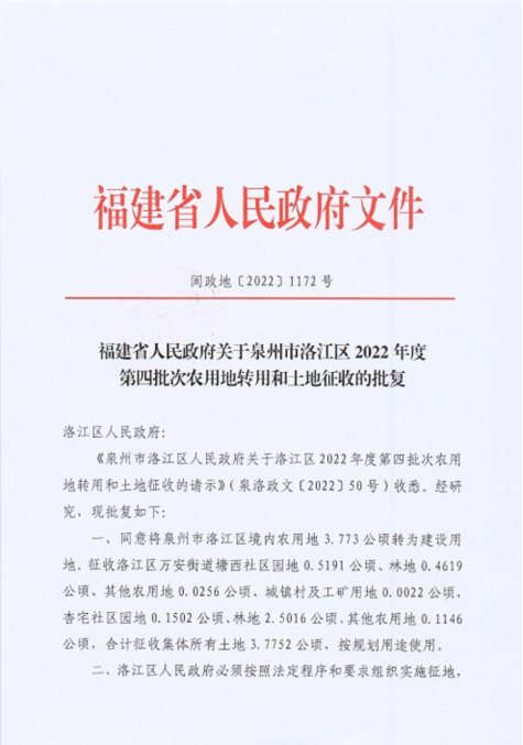 洛江区2022年度第四批次农用地转用和土地征收的批复及征收土地公告