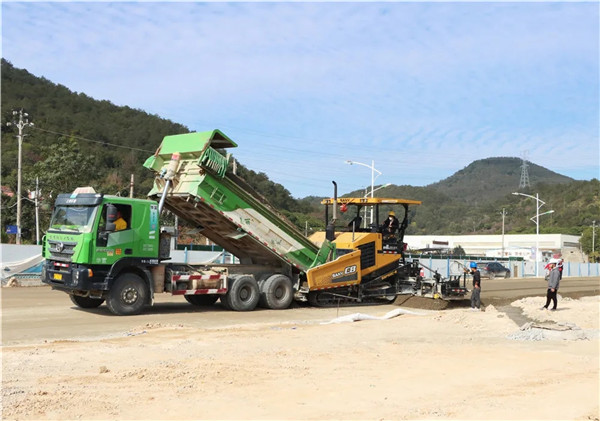 此外,在万虹路(河市中学至马甲新庵岭)拓改工程项目现场,运送沙土的大货车往返穿梭,摊铺机、压路机正紧张有序密切协作着,工人在一旁配合默契地进行辅助作业,一派繁忙的施工场景。