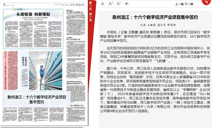 今年以来,洛江区委、区政府深入开展“1+3”专项行动,实施制造业数字化转型行动,通过出台《洛江区制造业数字化转型实施方案》等一系列政策措施,支持企业加快“智改数转”步伐,目前已有36家企业入库福建省2021年科技型中小企业名单,获评国家级服务型制造示范企业、项目2个,省级服务型制造示范企业2家。同时,成功打造铁拓机械国家级中小企业数字化转型典型案例,培育省新一代信息技术与制造业融合发展项目、省级及以上“专精特新”企业18家、2022年度省级数字技术创新应用场景2个,正在推进“5G+制造”项目建设4个。并以第五届数字中国建设峰会为契机,策划推动6个项目列入省数字经济项目,全区现有省级数字经济项目28个,今年来已完成投资12.86亿元。此外,洛江数字经济产业园(一期)项目顺利开工建设,湖南云箭集团、埃睿迪信息技术(北京)有限公司、泉州市金同信息科技有限公司、泉州市绿普森生物科技有限公司等4家企业成功签约入驻园区,数字技术与实体经济得到深度融合。