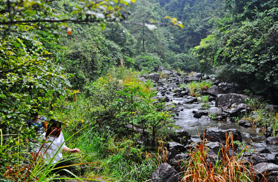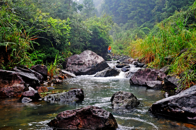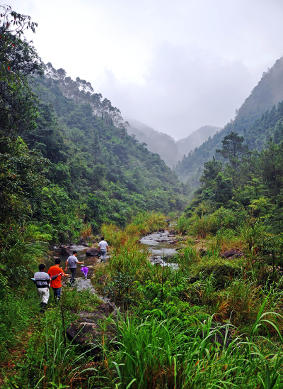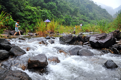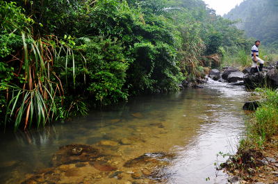 沿途曲曲弯弯的小路贴着山的一侧随着溪流的节奏往前延伸,走在滑溜溜湿漉漉的黄泥土路上,常有树根横伸一枝拦到路中央,我们只能边走边拨开杂树枝继续前行。在水面宽且浅的地方,又不得不踏上又圆又滑的石头慢慢挪步,被雨洗刷过的石头变得更加滑溜,让人难以站稳,一不留神,就会滑进潭水中,格外清凉。