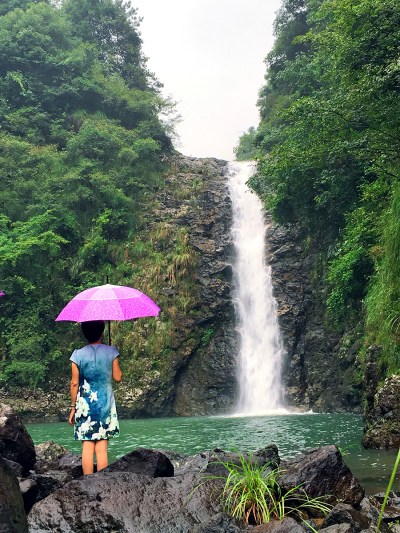 在树林中氤氲而起的薄雾之中,我们沿着石头路和泥土路不断往青龙谷的源头——青龙潭走去。走在水中,和水来了场亲密接触,全身湿透,但却不枉此行。就近找了块大石头坐下,空气中夹杂着潮湿之气和泥土草木的混合气味,扑面而来,清新而湿热的气流迅疾钻入身体。脚下,雨水冲刷过的痕迹跃然眼前,泥土地上,湿湿的,软软的。听着溪流声拍打石头的声响,清脆悦耳,美妙动听。