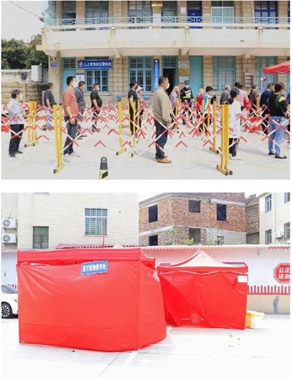 现场共划分为缓冲区、等候区、登记区、采样辅助区、临时隔离区、医疗废物暂存处、出入口等功能区域,设立3个采样台,严格落实体温检测、“1米线”间隔、规范佩戴口罩等防护措施,人员单向流动,出入口分开,确保核酸检测过程无死角。