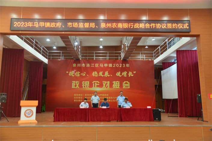 会上,马甲镇政府、马甲市场监管所、泉州农商银行马甲支行三方签订战略合作协议,建立长期稳定的政银企合作关系。根据协议,三方将聚焦提振市场信心,巩固拓展经济向好势头,全面提升普惠金融服务能力,有效发挥三方联动效应,支持中小微企业、个体工商户、新型农业经营主体等市场主体创新转型、开拓市场、提质增产争效,积极推动优化营商环境。