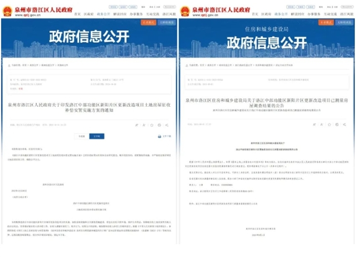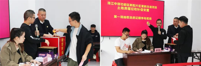 2023年5月区政府发布土地房屋征收预公告;6月双阳街道办发布协商选定房地产价格评估机构的通告,并到市评估协会公开抽取5家房地产价格评估机构完成被征收房屋和定向定价商品房基准价的评估工作;9月区政府发布《洛江中部功能区新阳片区更新改造项目土地房屋征收补偿安置实施方案》征求意见的公告,并于10月公告期满1个月后进一步修订完善后印发,12月新阳片区征迁工作指挥部举行首场公开抽取选房证顺序号活动……