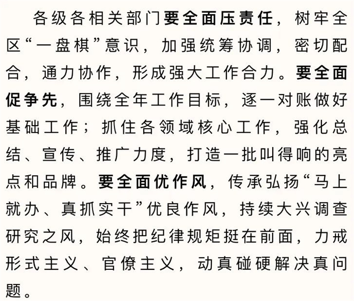颜丽明指出,过去一年,全区组织、宣传、统战、政法各条战线以开展主题教育为契机,以实施“深学争优、敢为争先、实干争效”行动为抓手,紧扣中心、服务大局,务实担当、创新创优,做了大量卓有成效的工作,既为一域争光,更为全局添彩。