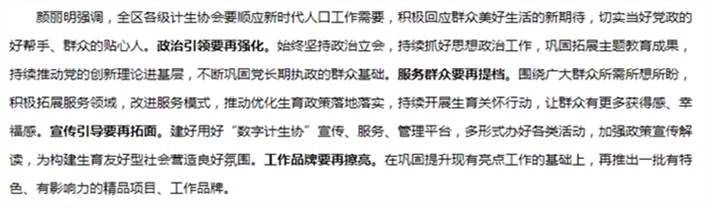 颜丽明要求,全区各级党委、政府要主动关心和支持计生协会工作,及时研究重要问题、解决实际困难。各相关部门要立足协会需求,支持计生协会开展业务活动;各级计生协会要坚持“党政所需、群众所急、协会所能”原则,加强协会组织和队伍能力建设,不断提升整体工作水平。