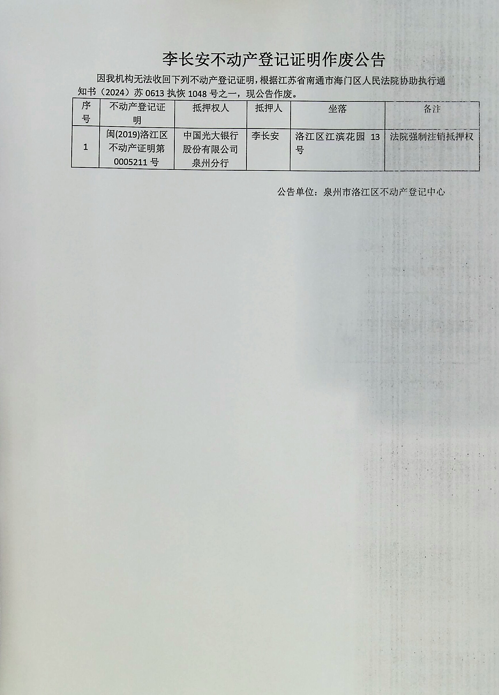 李长安不动产登记证明作废公告
