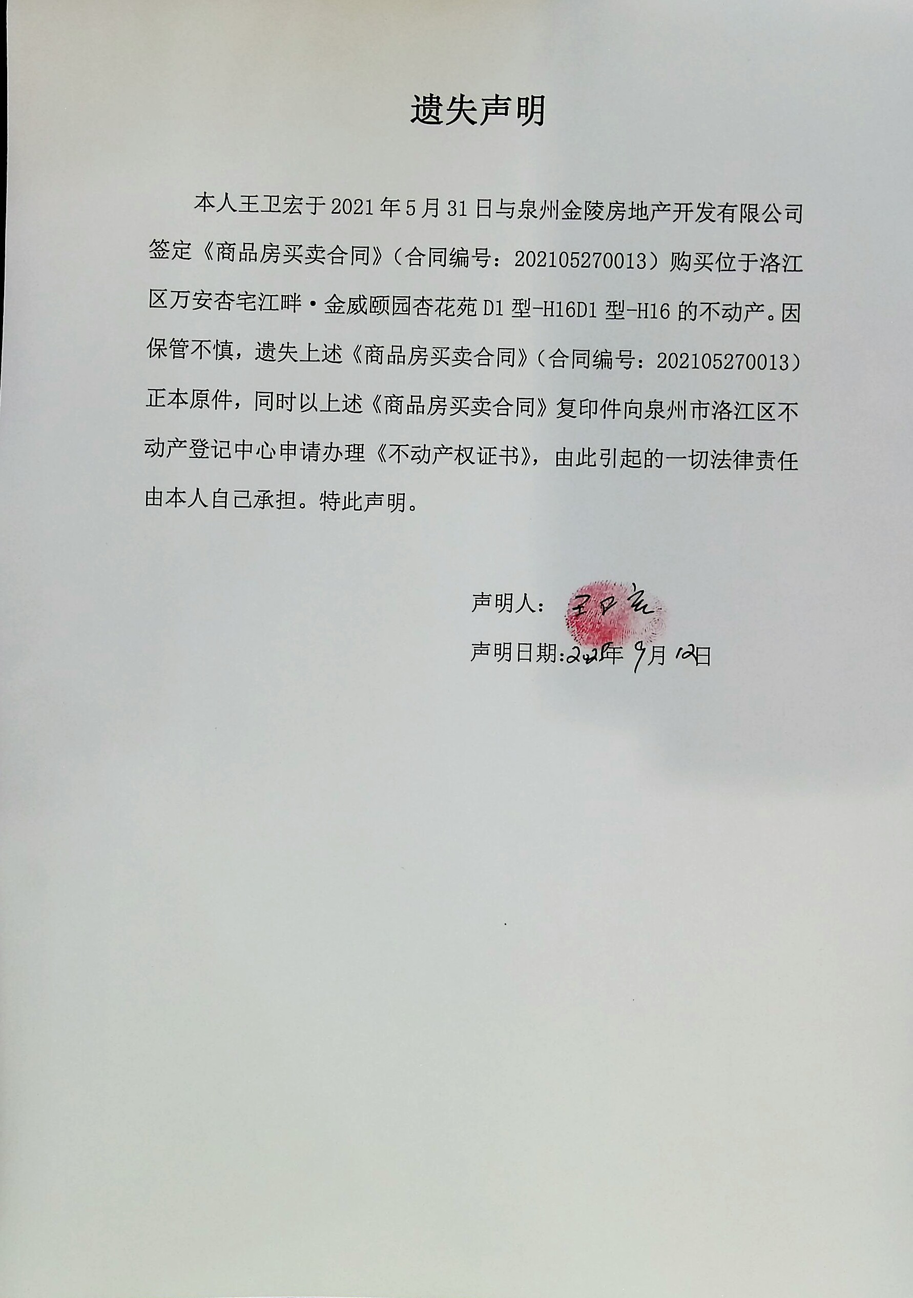 王卫宏商品房买卖合同遗失声明