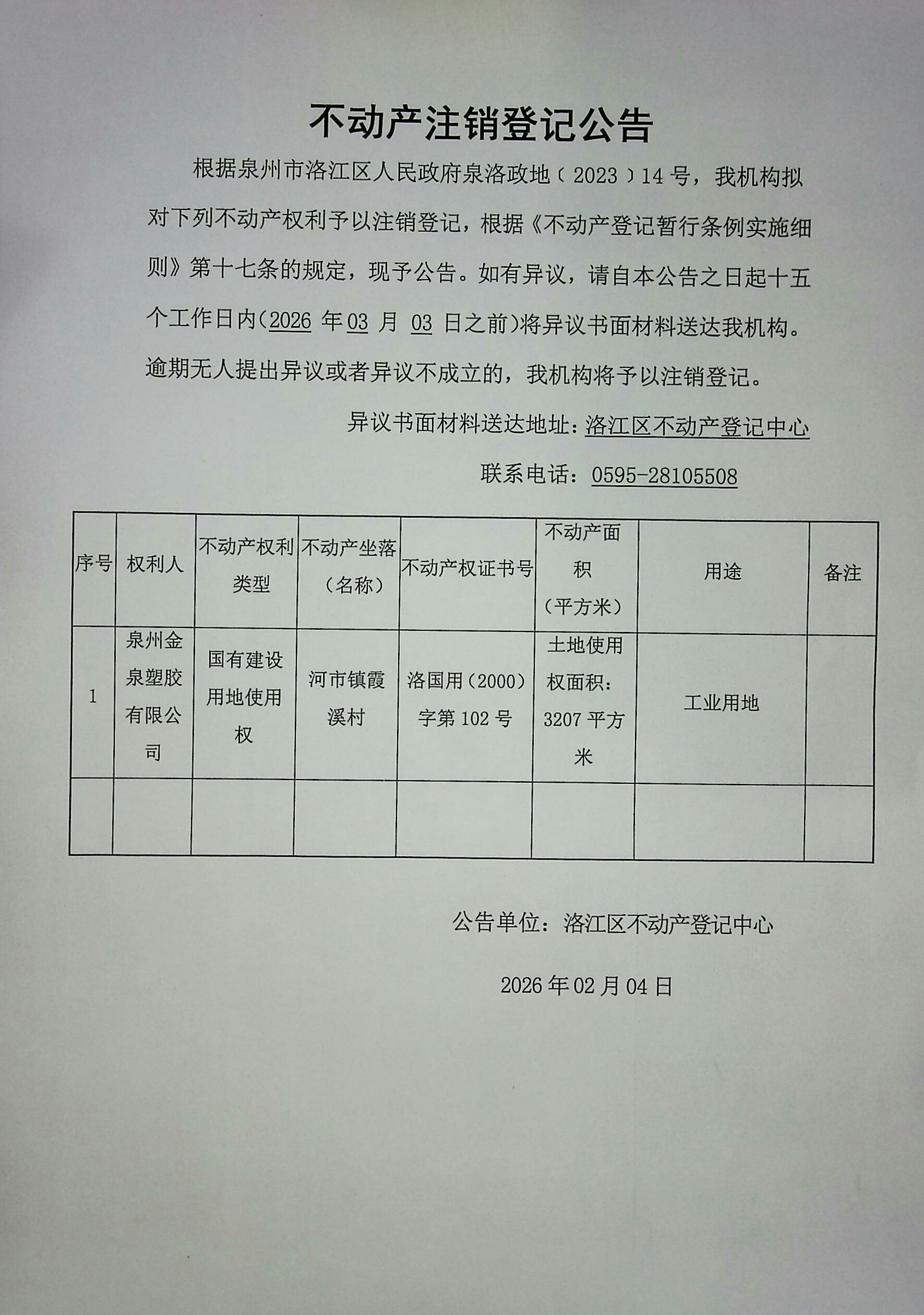 泉州金泉塑胶有限公司不动产权注销公告