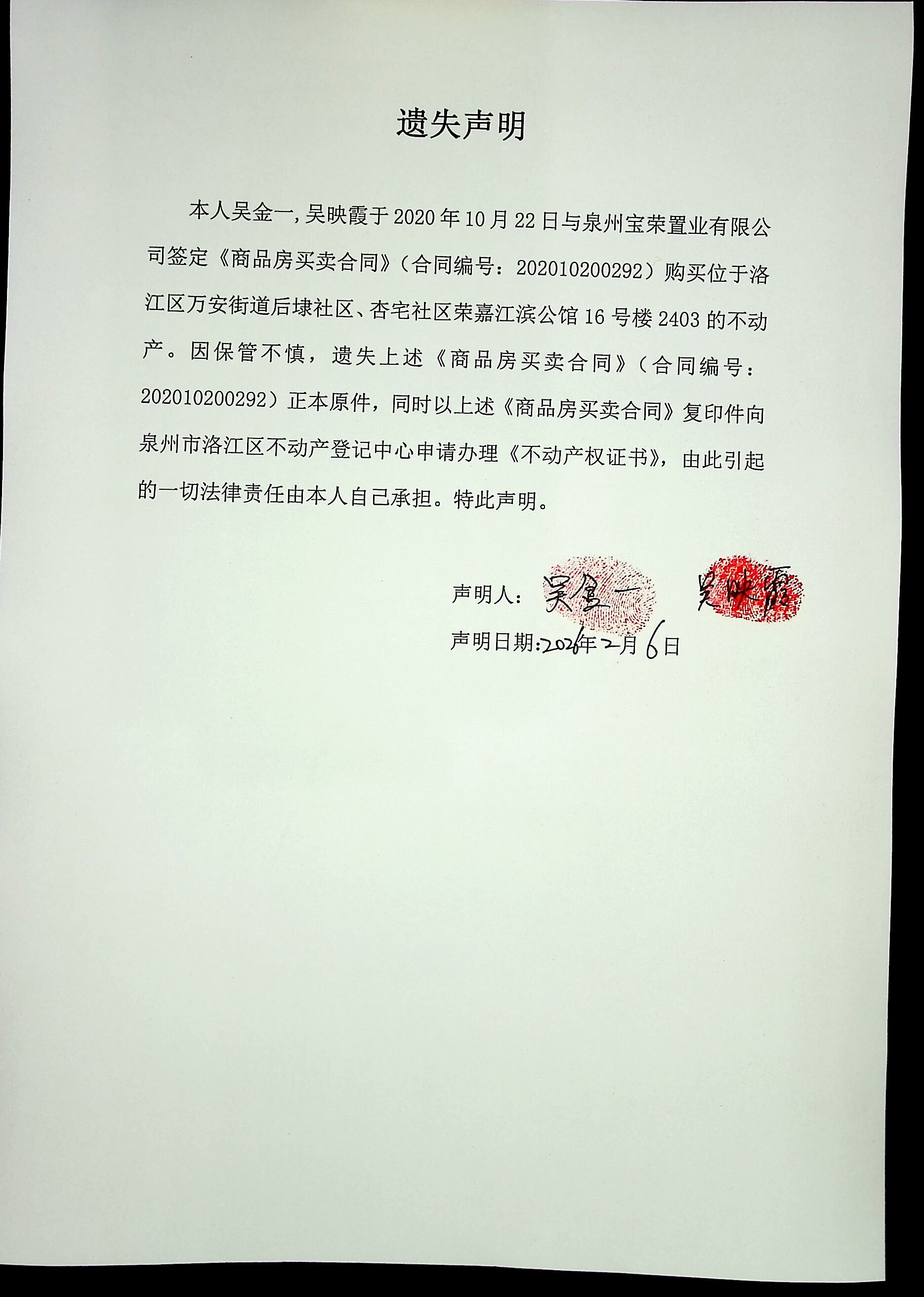 吴金一、吴映霞购房合同遗失声明
